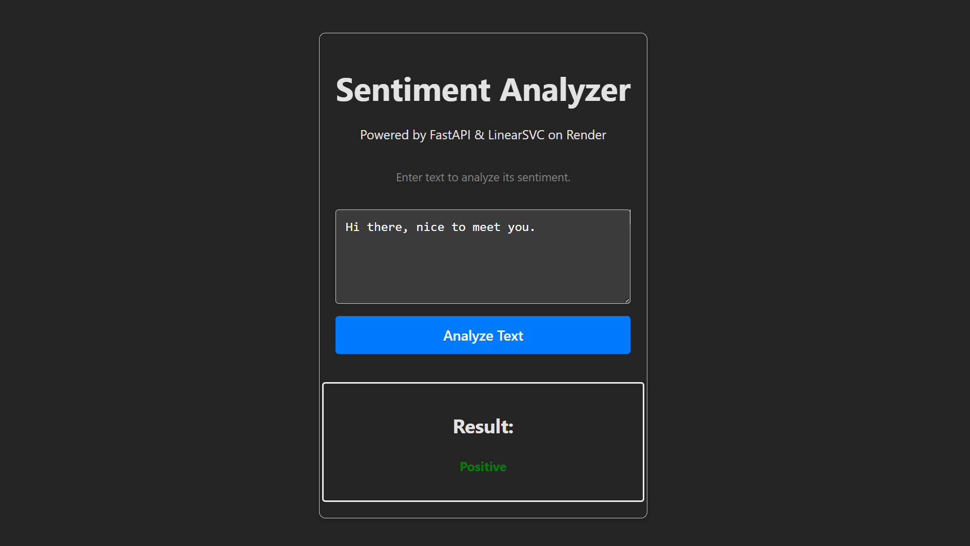 End-to-end full-stack AI application to analyze positive/negative/neutral sentiment in a string. Dockerized python backend deployed on render. Frondend on netlify.